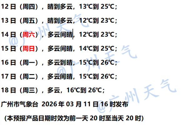 广州市征象台瞻望,改日三天广州多云到晴,昼夜温差较大,其中3月12昼夜间起受弱冷空气影响,气温小幅下落,海陆风力再次加大。