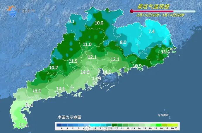 14日,粤西市县多云间阴天,其余市县晴到多云。最低气温:粤北、珠三角北部和粤东市县7~10℃,雷州半岛17~19℃,其余大部分市县11~14℃。