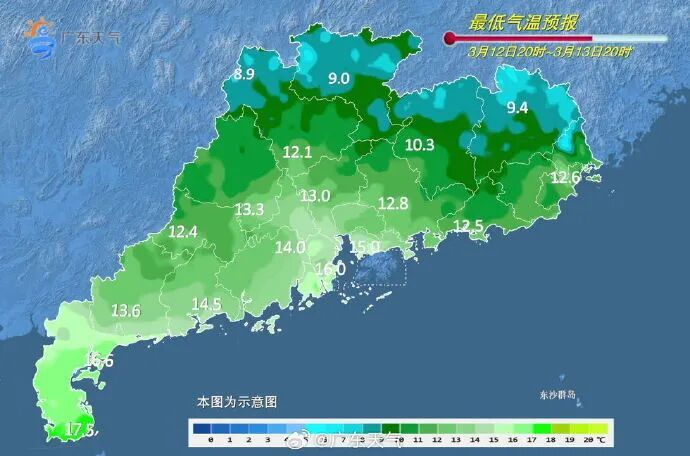 12-13日,全省大部晴间多云。最低气温:粤北、珠三角北部和粤东市县7~10℃,雷州半岛15~18℃,其余大部分市县11~14℃。