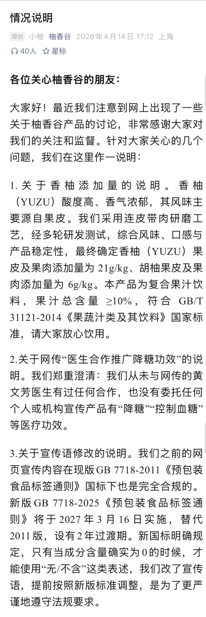 对于家具标注“果汁总含量≥10%”这个点,其确凿4月14日,柚香谷官方公众号就发布过情况证据:“本族具为复合果汁饮料,果汁总含量≥10%,顺应GB/T31121-2014《果蔬汁类过甚饮料》国度步履,请全球省心饮用。”该证据同期对网传“与医师团领路行降糖功效”以及企业宣传用语疗养等情况一并作出了清晰与证据。