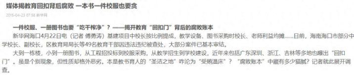 2015年海南省海口市,近80年历史的海南华裔中学,曝出两任校长在征服上荒诞捞钱,每逢新学期采购,必有3万到5万元的提成,单征服一项的贪腐就达十多万元。