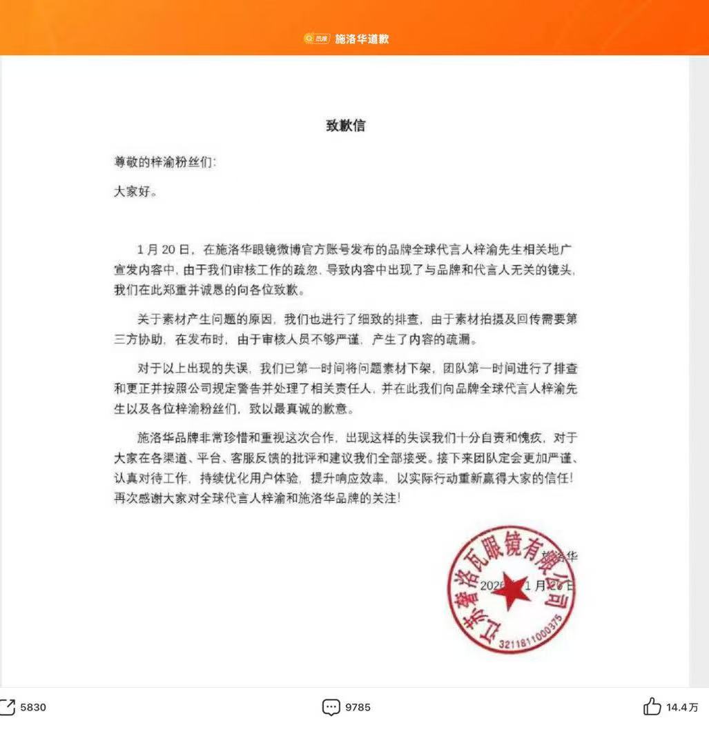 1月20日下昼,施洛华眼镜在其微博官方账号发布致歉信,称与品牌众人代言东说念主梓渝相干的广宣发试验中,由于审核责任的果决,导致试验中出现了与品牌和代言东说念主无关的镜头,在此珍重并安分的向诸位致歉。