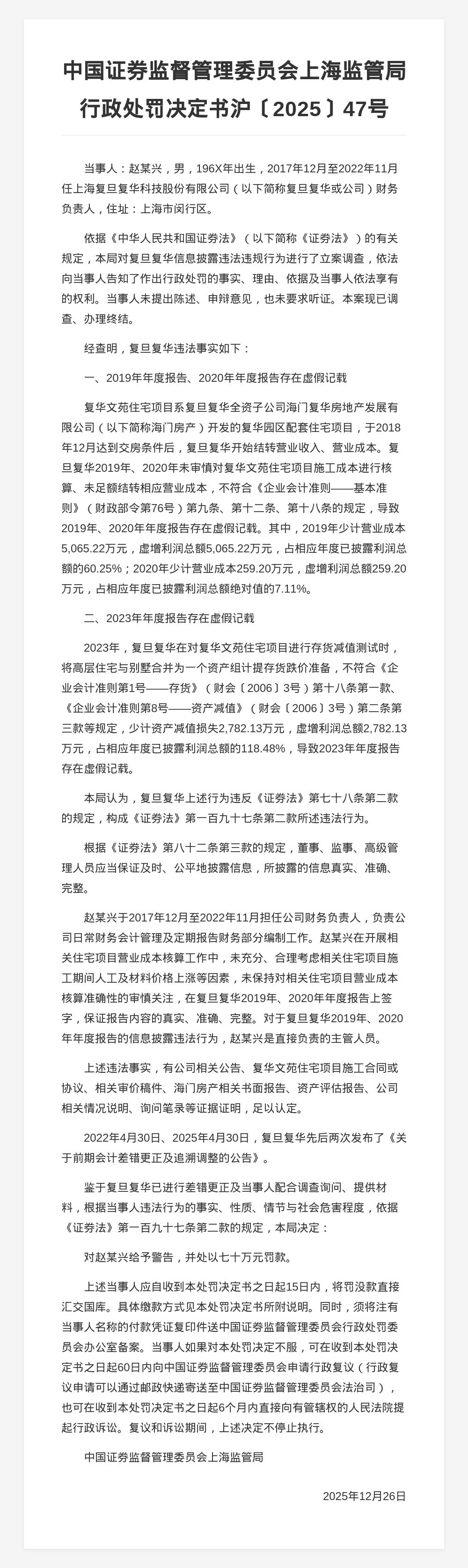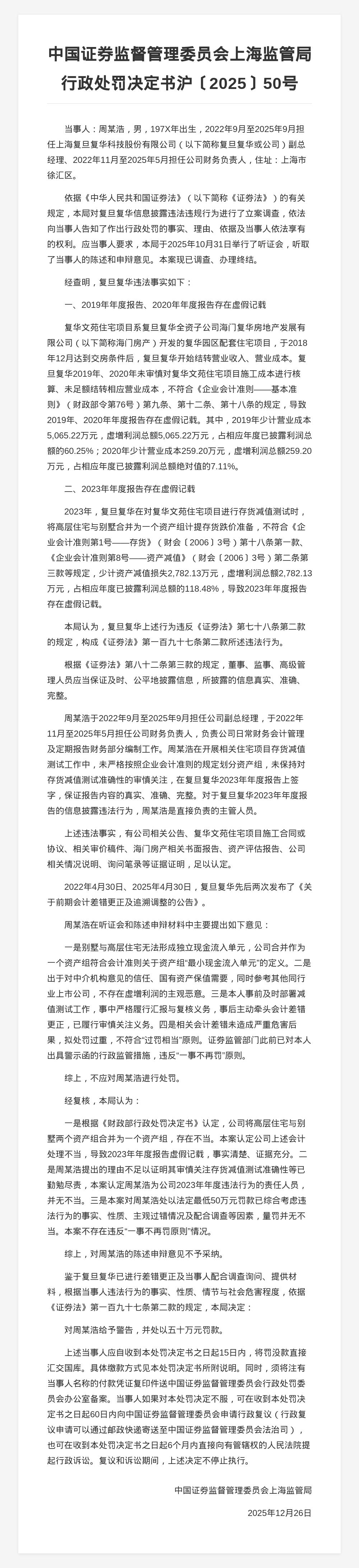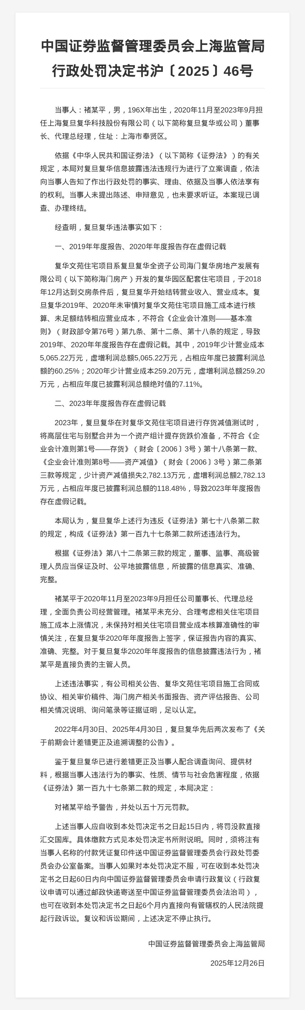 决定书露出,复旦复华作恶事实如下:2019年年度论述、2020年年度论述存在诞妄记录;2023年年度论述存在诞妄记录。