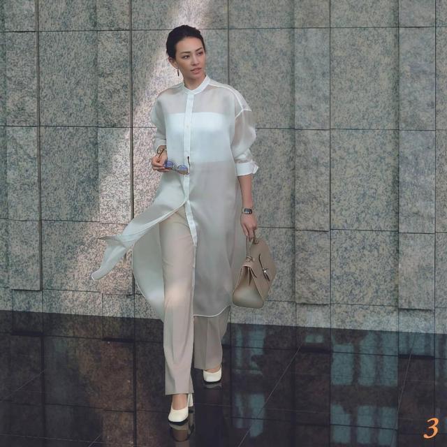 轻慎重少量的场面,穿得从简少量,更显专科性!但若念念要化解严肃,还得靠松弛感,版型宽松的长衬衫,凭借透视感的面料,开脱了呆板气味,搭配垂感十足的直筒长裤,对形体的包容度极高。