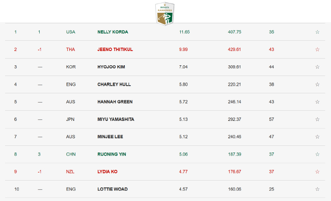 内莉·科达同期赢得100分,卓越提提库,回到天下第一位。