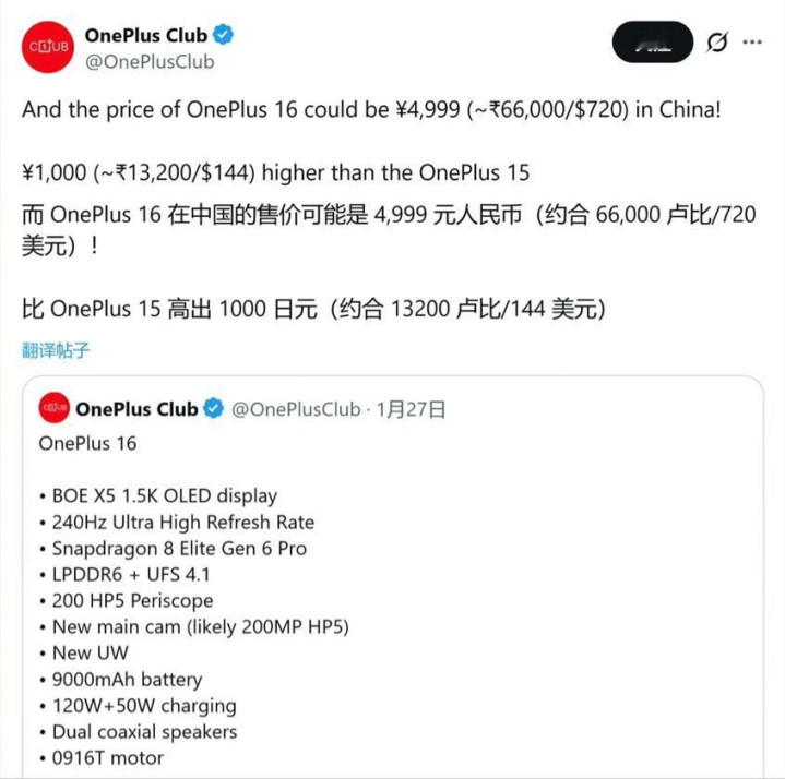 第一是价钱。受供应链加价影响,有爆料称一加16起步价或涨至4999元,若是属实,那对用户或然是好音讯。