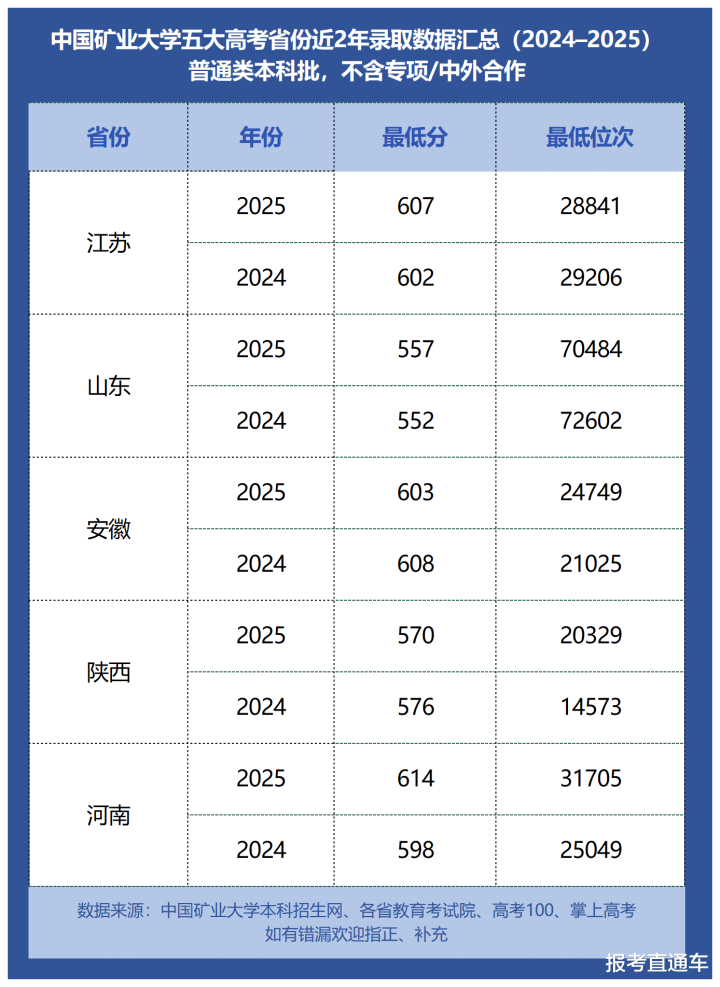 从分数维度看,矿大近两年在多省份登第线呈现“等分段可及”的特征,以下是矿大在江苏、陕西、河南、山东、安徽五个高考大省比年来的登第数据: