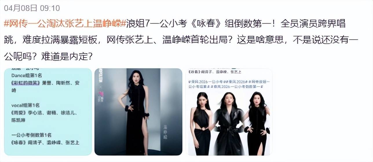 更离谱的是,录播还没上线,一公小考得益、淘汰名单就先全网疯传,《咏春》组倒数第一、温峥嵘张艺上被淘汰的音书,蓦的冲上热搜,把本就错落的节目,搅得更扑朔迷离。