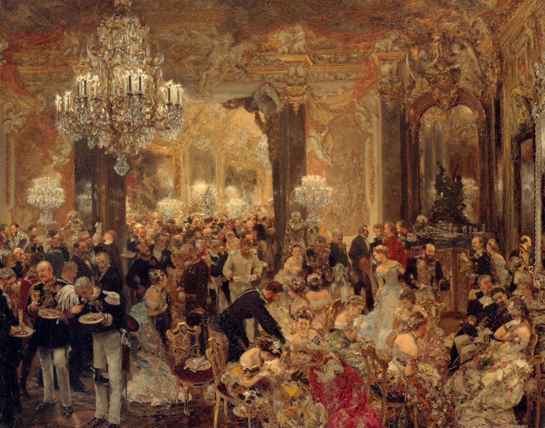 1878 年,正是德认知帝国崛起、柏林成为欧洲高贵齐会的年代,53 岁的门采尔已褪去早年历史画的庞大叙事,转而深耕风俗画的幽微肌理。这幅 71×90cm 的布面油画(Das Ballsouper,现藏德国柏林旧国度好意思术馆),莫得别传东说念主物,莫得宗教光环,只定格了一场泛泛表层舞会的晚餐技巧:长桌铺着纯碎的桌布,银器、水晶杯、酒瓶与残余的好菜杂沓;身着华服的男男女女或站或坐,有的柔声交谈,有的碰杯致敬,有的望向舞池所在;侍者们衣裳深色制服,闲适地在东说念主群中穿行;配景是高挑的厅柱、垂落的丝绒帷幔、还有吊挂着的巨型水晶吊灯,烛火与灯光交汇成一派柔顺却不灼眼的光晕,莫得洛可可的甜腻,也莫安妥代宗旨的割裂,唯有千里甸甸的、垂手而得的确实。