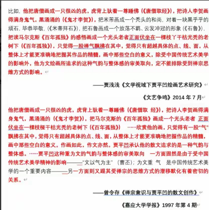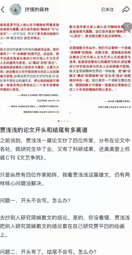 2014年,贾淡淡在《文艺争鸣》上发表了一篇有计划贾平凹画图艺术的论文。整篇著述险些全是勉强,连“米芾拜石”齐能写成“米蒂拜石”,可见她根柢没精良看过原文。更离谱的是,这篇论文尽然顺利通过中枢期刊的审核,冠冕堂皇地成为她的学术后果。
